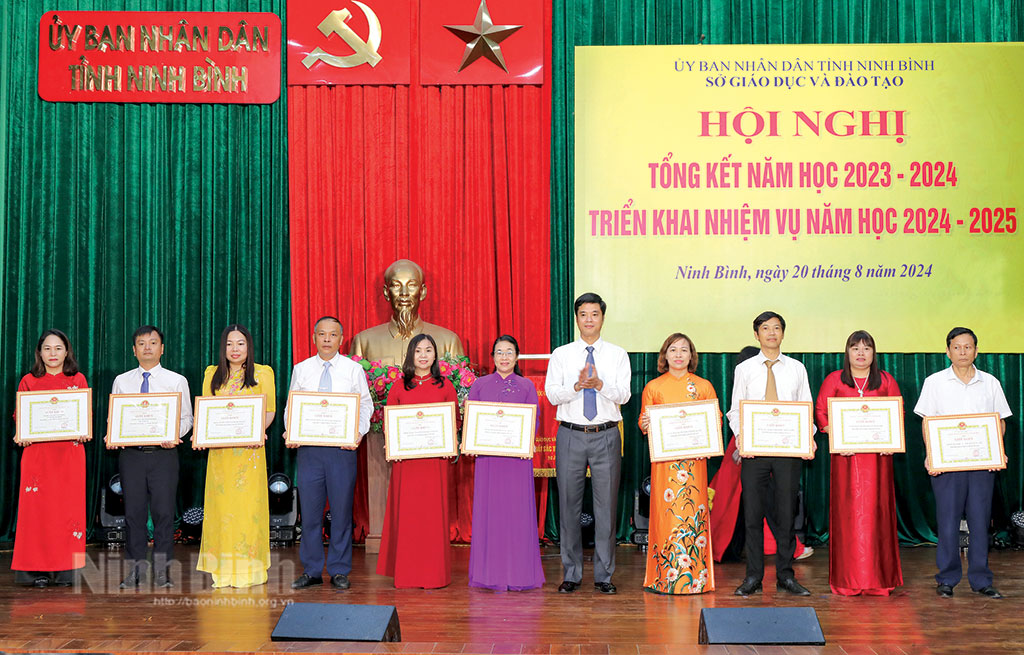Đồng chí Phan Thành Công, Tỉnh ủy viên, Giám đốc Sở Giáo dục và Đào tạo trao giấy khen cho các tập thể hoàn thành xuất sắc nhiệm vụ năm học 2023-2024. Ảnh: Minh Quang